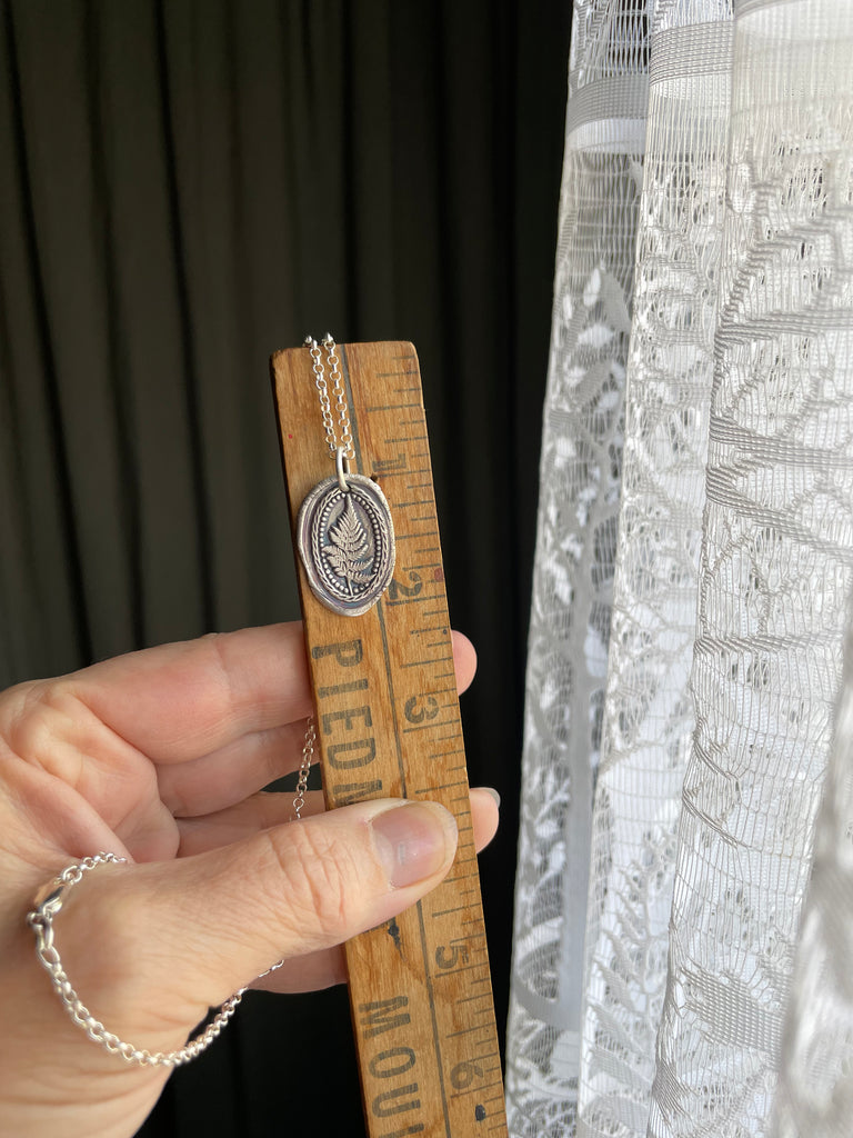 This beautiful fern is a hefty all sterling medallion. This substantial pendant hangs from an 18 inch long sterling rolo chain with lobster clasp.